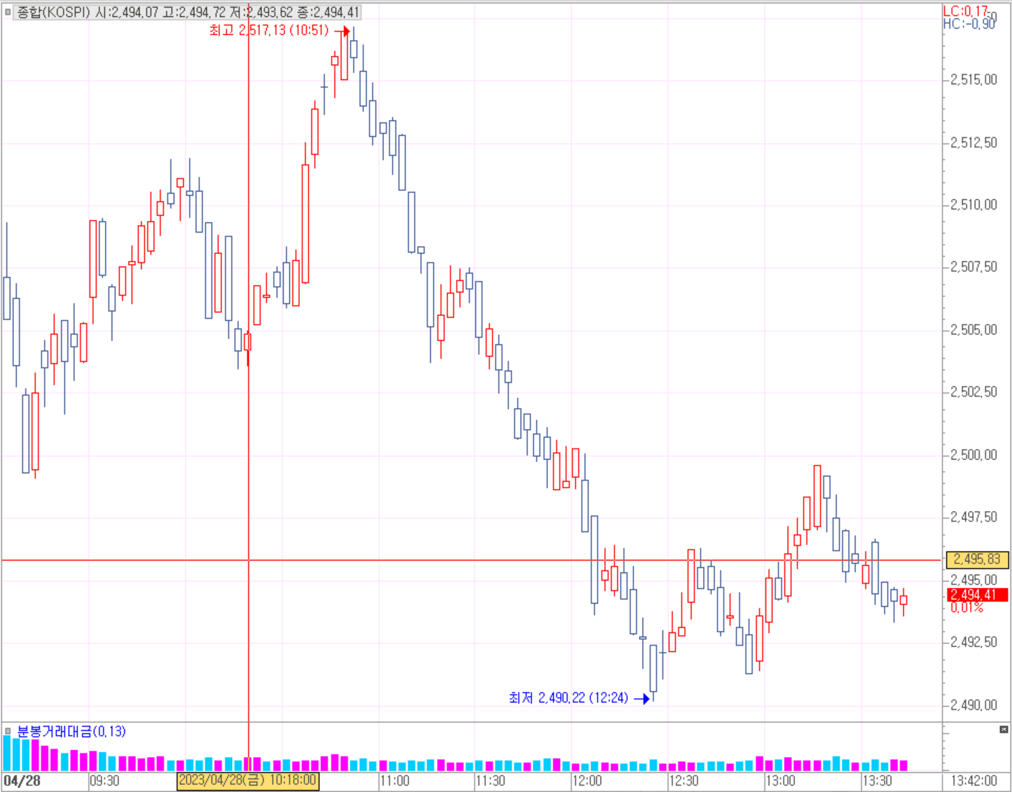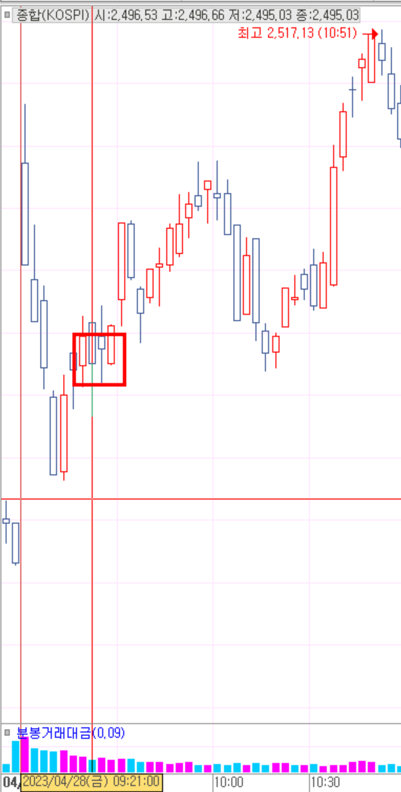 오늘 장중 2517선 고점까지 상승하였으나, 현재 2,495선으로 하락한 상태로 지나가고 있다.