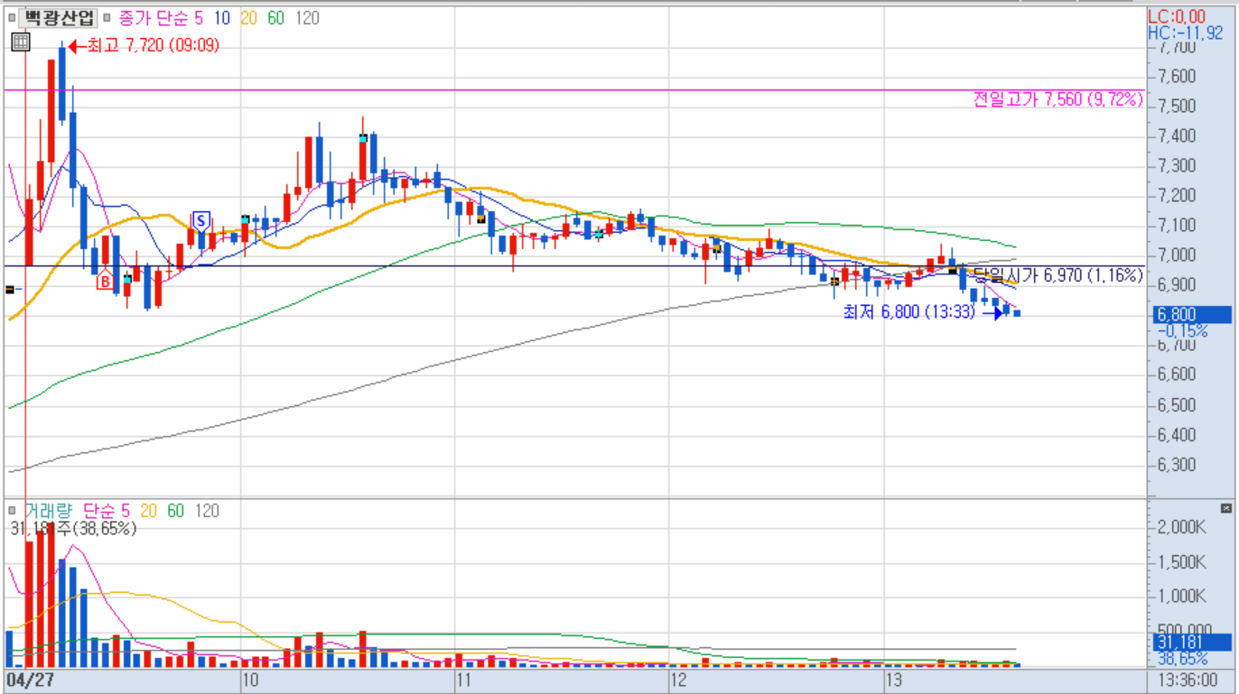 6,960원 매수 후 시가보다 하락은 하였지만 -2% 수준으로 다시 시가를 돌파하는 것을 보고 수익구간을 짧게 잡고 진행하였다. 시가 돌파 이후 상승구간에서 매도 포지션을 잡고 1.49% 익절하였다. 약간의 뇌동매매가 있긴하였지만, 짧게 단기매매를 진행해 볼 생각이다. 이후 더 상승하였으나, 역시나 전일고가까지는 가기 어려웠다. 단기매매는 수익구간에서 익절을 하도록 하자.