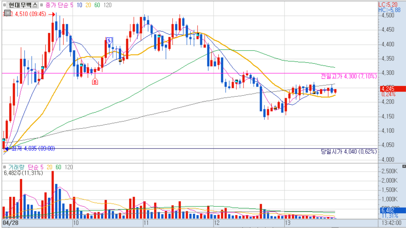 | [매매일지]현대모비스 관련주, 종목분석, 주가분석, 미래전망, 매출액, 영업이익(재무제표), 차트분석 - 23.04.27(목) (0) | 2023.04.27 |
