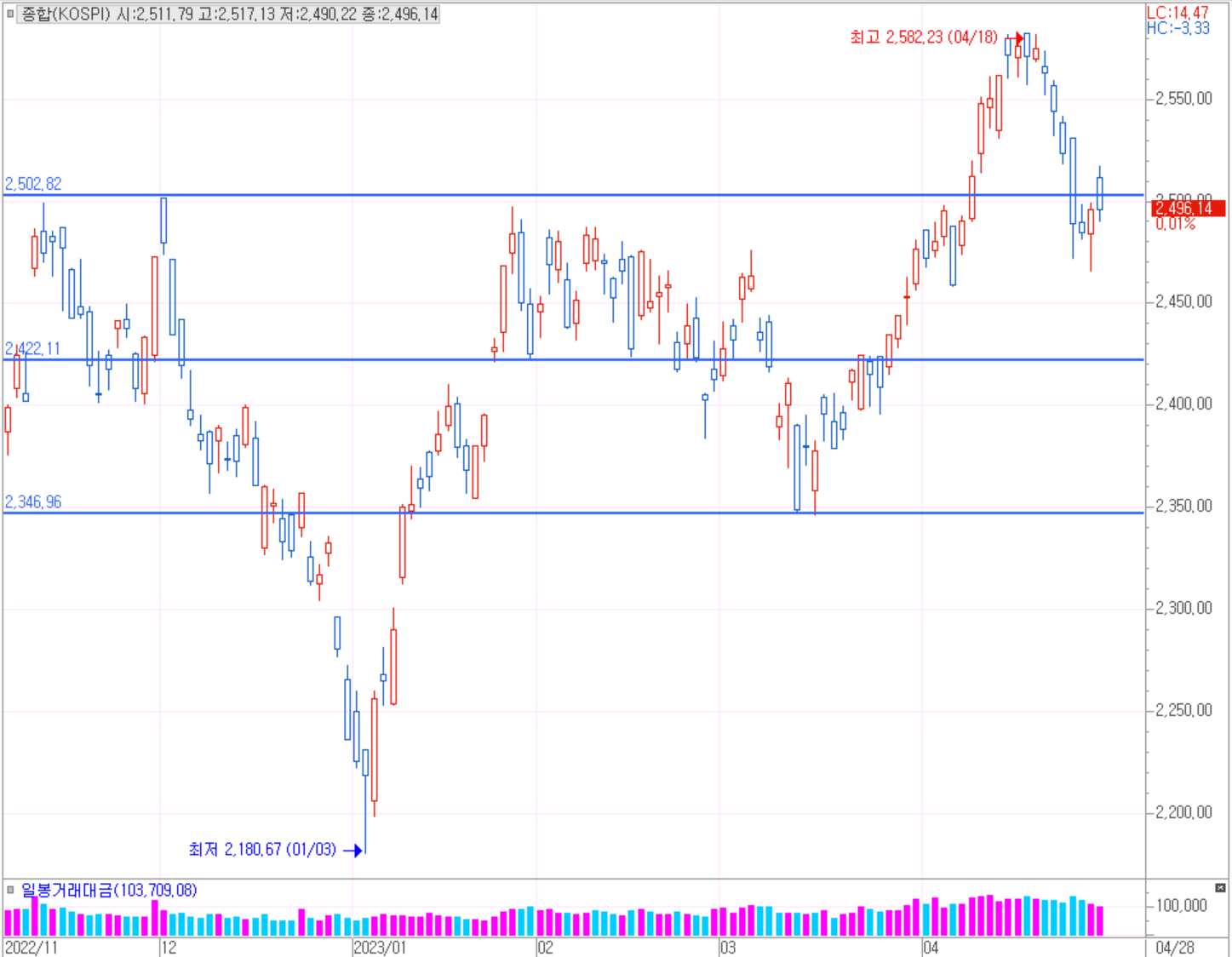 코스피 일봉상의 2500선을 돌파하고, 현재는 무너졌다. 4.25일 이후 약간의 상승장이다.