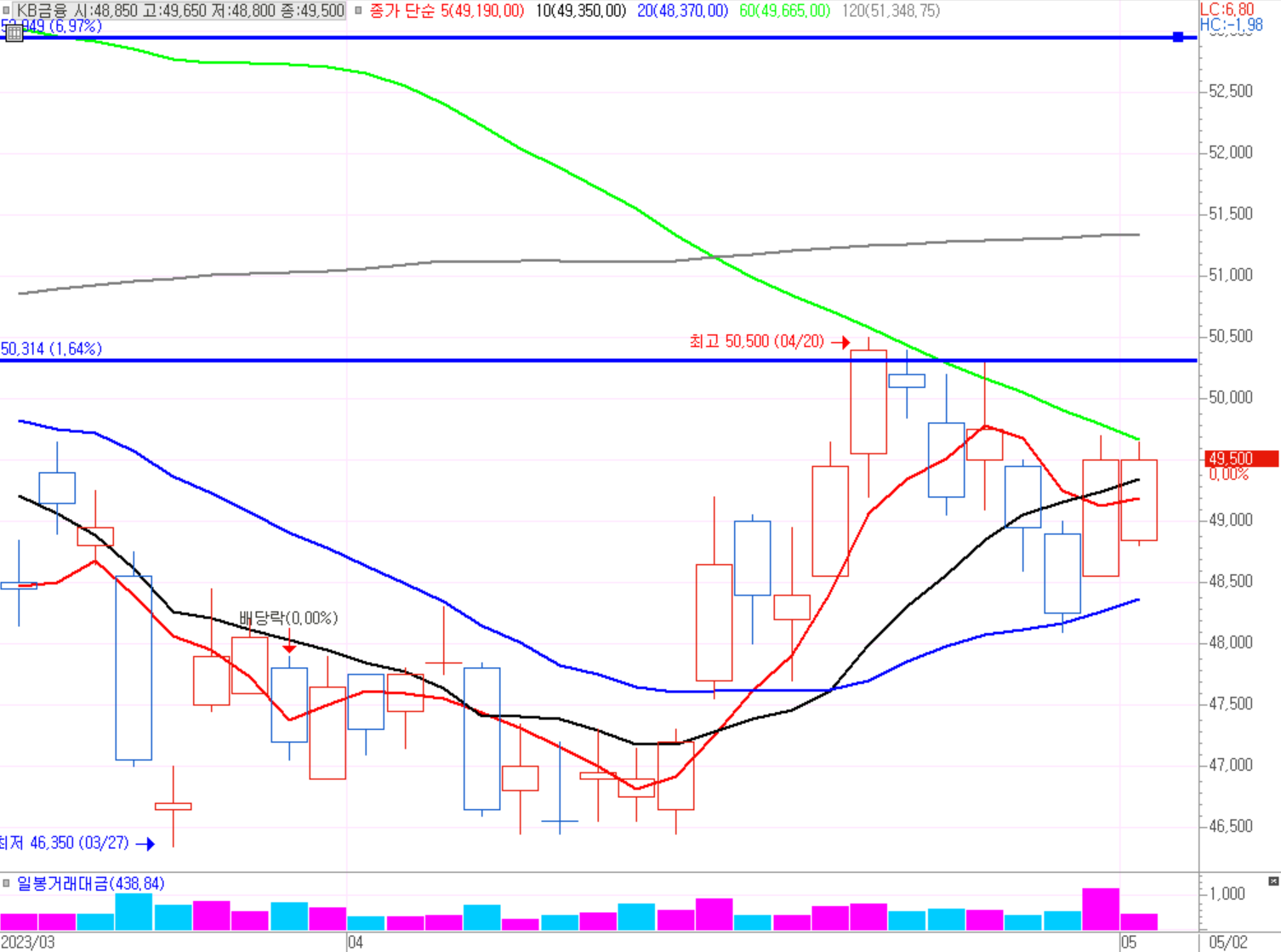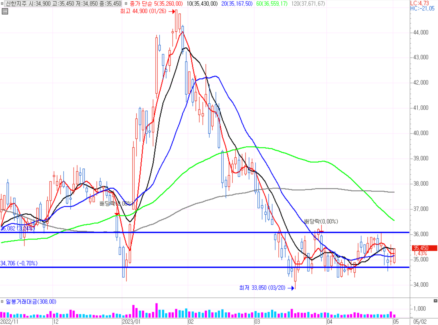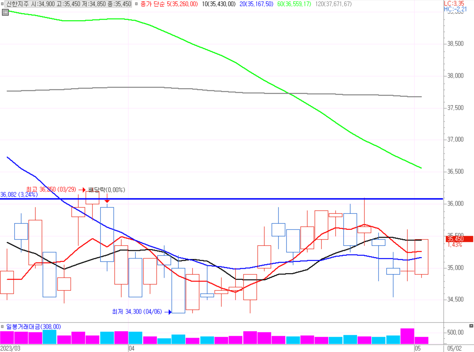 기준일(4월25일)보다 아래에서 움직이고 있다. KB금융과 동일하게 흐름이 좋아보이지 않는다. 1월 말 상승 이후 저점 횡보구간이다. 34,700원 저점 매수 후 36,000원 구간까지 짧은 스윙투자가 가능해보인다.
