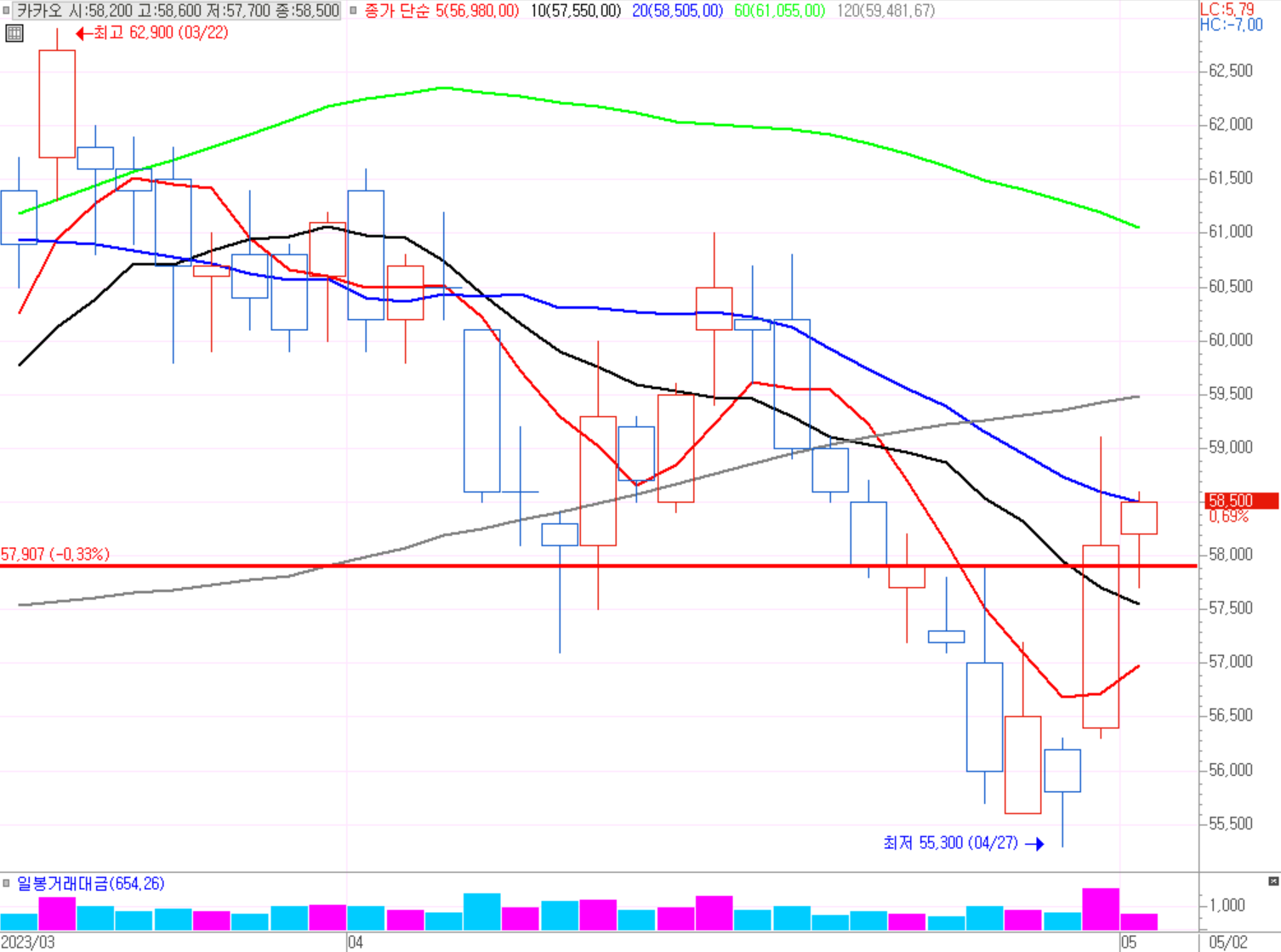 기준일(4월25일) 기점보다 상승하면서 네이버와 같은 흐름이다. 기술주로 네이버와 같이 저점에서 움직이고 있다. 카카오와 네이버의 부활을 기대하며, 유심히 지켜 보자.