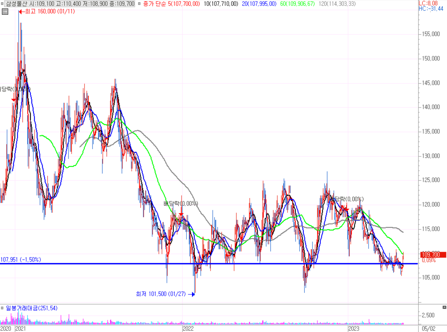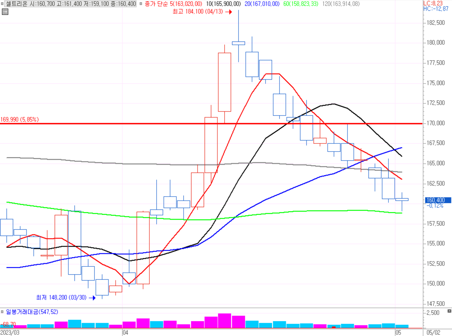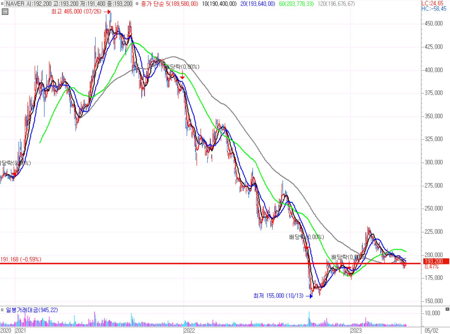 기준일(4월25일) 대비하여 지속적으로 하락중이다. 저점에서 횡보를 지속적으로 하는 모습이다. 14만6천원 ~ 18만원선안에서 횡보를 하고 있다. 16만원 지지선을 뚫고 내려가면 14만 6천원에서 저점 매수자리가 보인다. 오래 지켜봐야겠다.