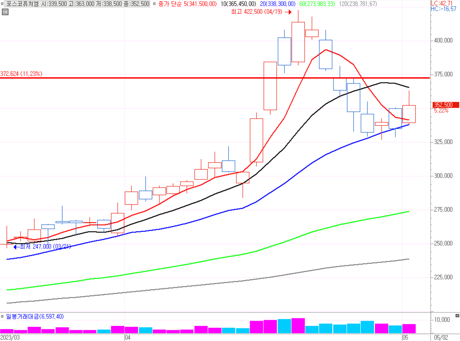 기준봉(4월 25일)을 현재는 지수와 동일하게 돌파하지 못했다. 이차전지소재, 첨단화학소재, 산업기초소재 관련 업체로 포스코주 강세였었던 4월 대비 현재는 강한흐름을 보이지 못하고 있다. 넓게 봤을때도 고점에서 하락하는 중으로 위험해보인다. 포스코주의 강세는 꺼진 것일까? 2차전지주의 대장은 아직 에코프로 인가보다.... 포스코는 2차전지관련하여 많은 사업중으로 추후 대장주가 될지 눈여겨봐야 할 것 이다.