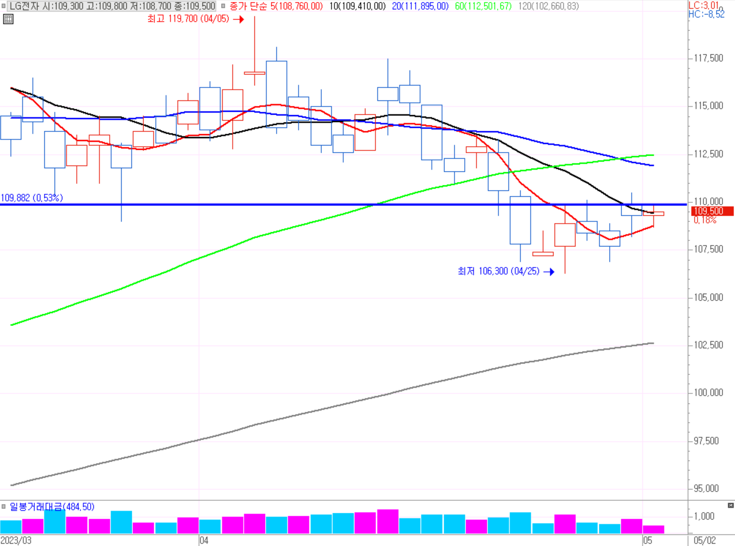 기준일(4월25일)대비 많은 하락이 없었다. 강한 흐름 후 박스권 횡보 자리에서 지수보다 버티면서 횡보 중이다. 상승 중 저점 매수의 자리가 아닐지 확인이 필요해 보인다. LG전자는 최근 전장(자동차) 관련하여 많은 사업을 진행중으로 알고 있다. 전장부품의 대장주로 강한 흐름 안의 지지를 보아 더 좋은 모습을 보일 것이다. 단기적으로 대응이 해볼생각이다.