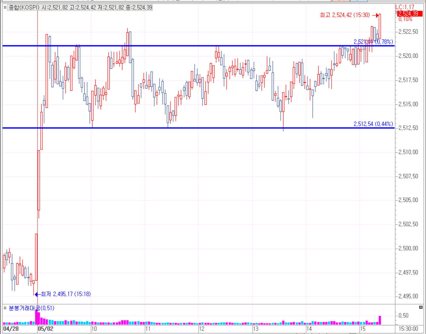 23년 5월 2일 화요일 현재시간 14:30분경 2,500선을 지지반등하여 현재 2,518선에서 상승 지지 구간을 형성되었고 최종 2,524선으로 상승하면 마무리하였다.