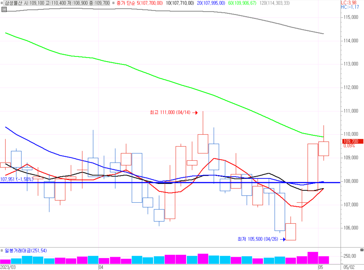 4월 25일 기준일 이후 상승을 보여주고 있다. 삼성물산은 제일모직과 합병 후 건설/상사/패션/리조트/급식·식자재유통/바이오 산업을 아우르고 있다. 건설부문 32%, 상사부문 50%, 패션부문 4.5%, 리조트부문 1.5%, 급식/식자재유통 6.7%, 바이오부문 4.1%이다. 건설, 유통 회사로 봐야 할 것 같다. 횡보를 지속적으로 하고 있는 종목으로 10만원 ~ 12만원 선 횡보중이다. 종합적인 회사라 작은 이슈에 움직이기는 어려울 듯 하다.