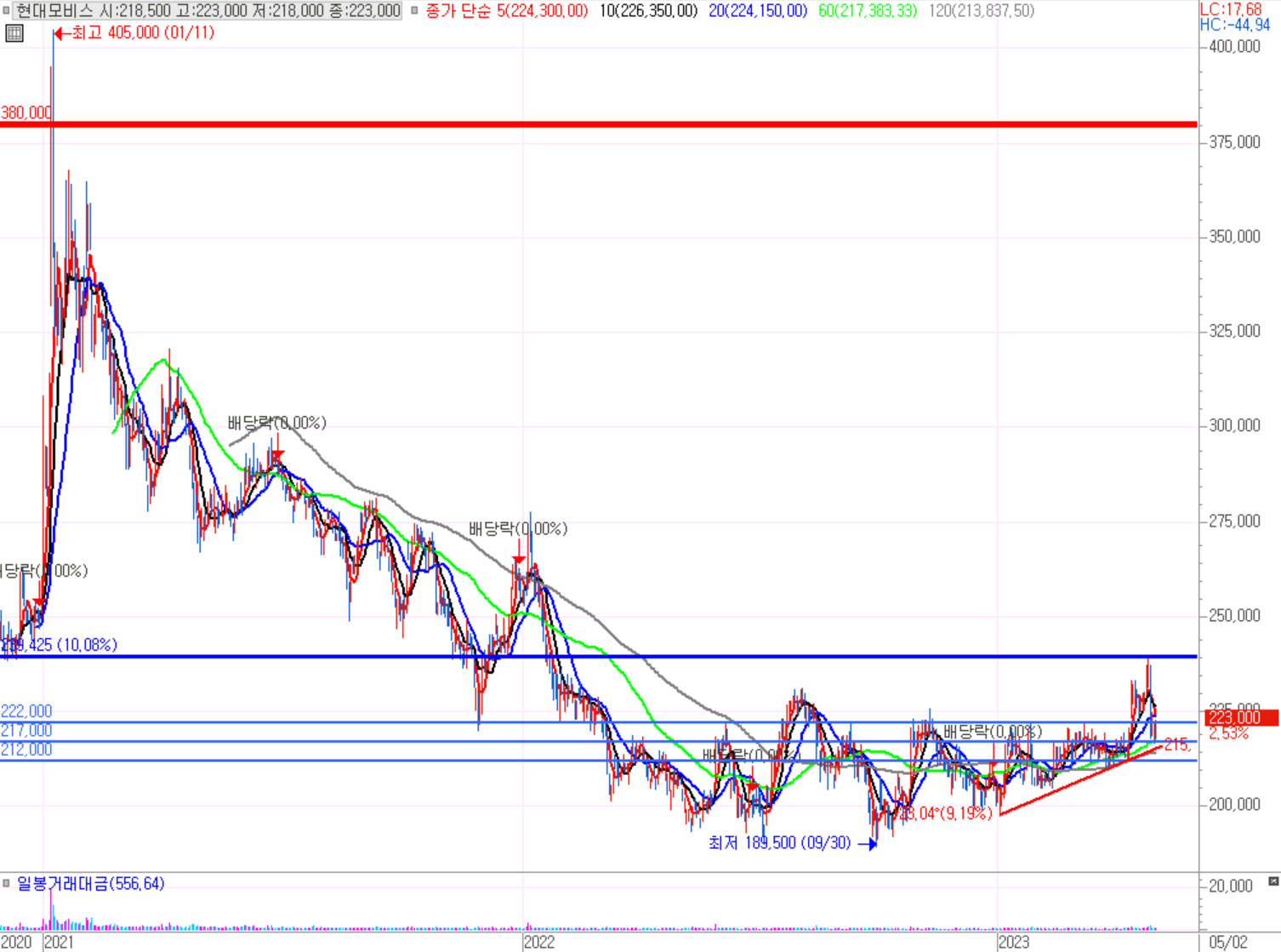 4월 25일 선을 돌파하고 상승국면으로 가능 방향이다 하지만 이전 대비 하락 추세에서의 반등으로 보여, 넓게보면 바닥자리에서의 반등이 있었고, 이후 22만원선까지 상승 이후 185,700 저점 찍고 약간 상승중이다. 아직까지 큰 상승국면이나 좋은 움직임은 없지만 지금을 시작으로 좋은 모습을 보이는지 확인해볼 필요가 있을 것 같다. 장기적으로 바닥에서 상승시 좋은 매수자리를 줄것으로 보인다.