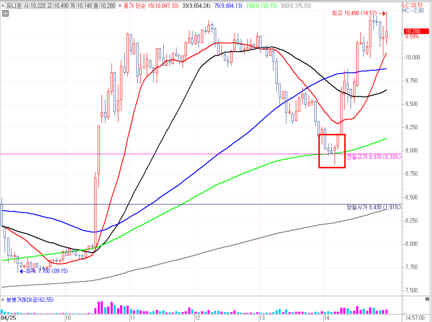 당일시가 근방에서의 상승 흐름이 보였으며, 해당 종목도 유니온과 같이 관심을 가지고 확인이 필요하다.
