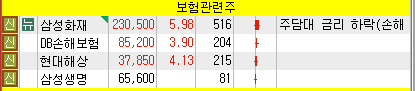 손해 보험사 금리가 가장 저렴한 곳으로 삼성화재로 5.52 -> 4.92로 (-0.60) 하락하였다. 손해보험 관련주들이 지수하락과 반대로 상승하는 모습이 보이면서, 추가적인 흐름 파악이 필요하다.