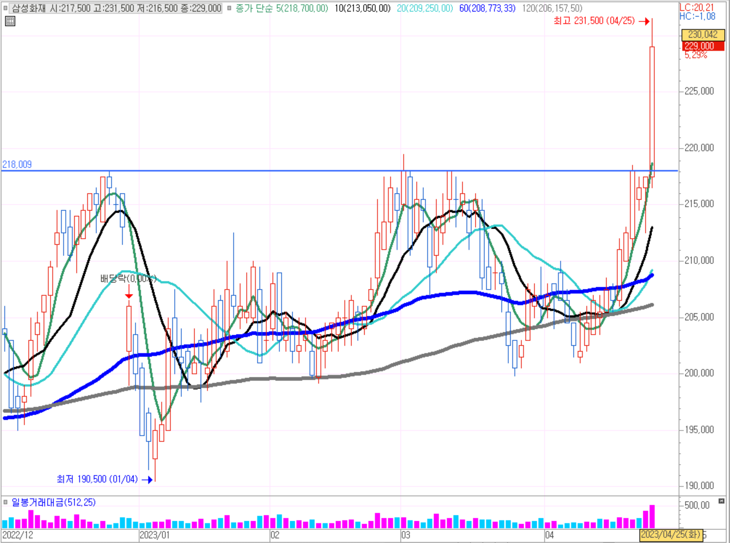장중 25%가량 상승하였으며, 거래대금 4500억원으로 코스피 지수를 역행하는 강한 종목으로 확인된다.