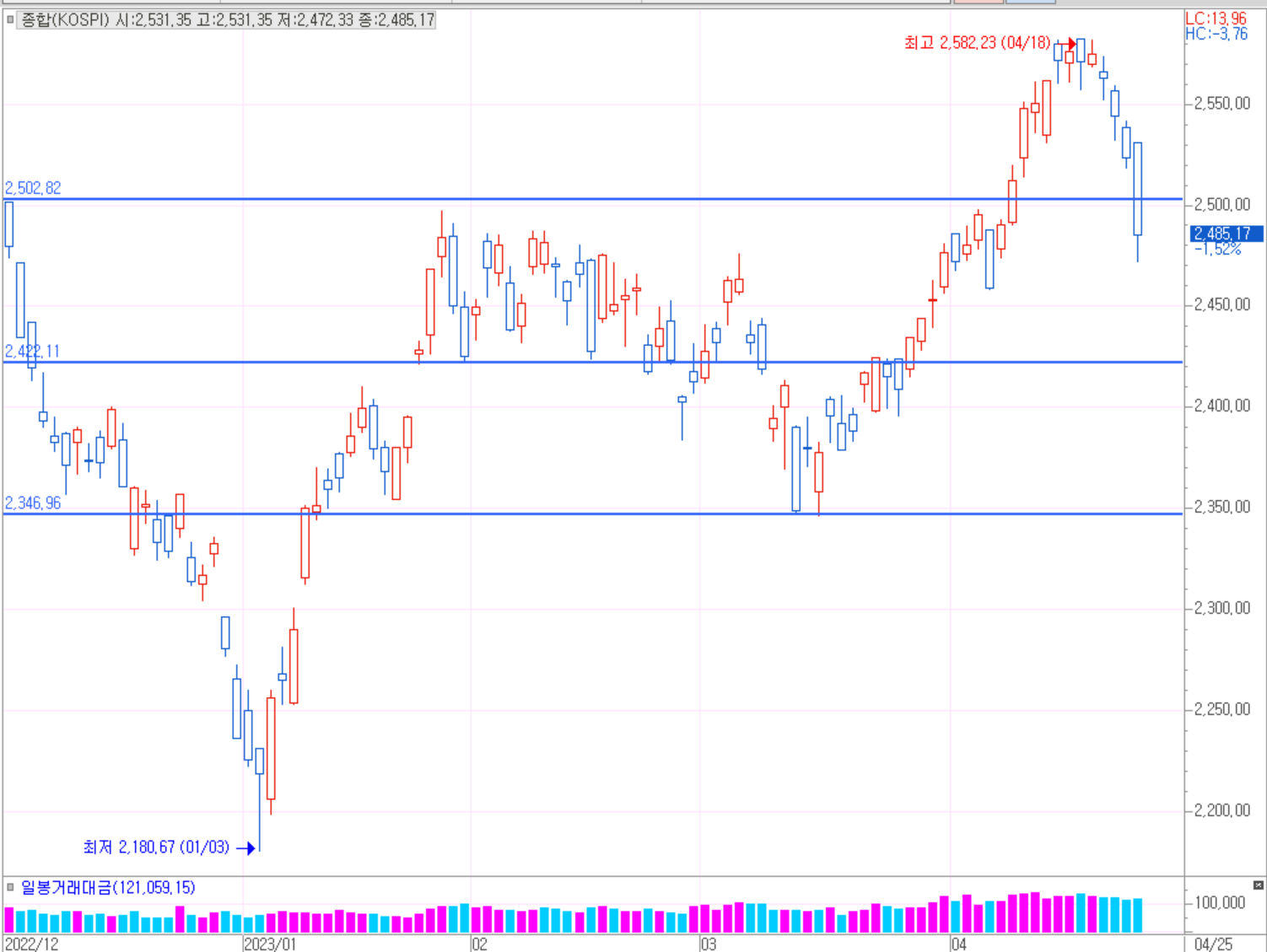코스피 지수가 1차 지지선으로 보이는 2500선 아래로 떨어졌다.