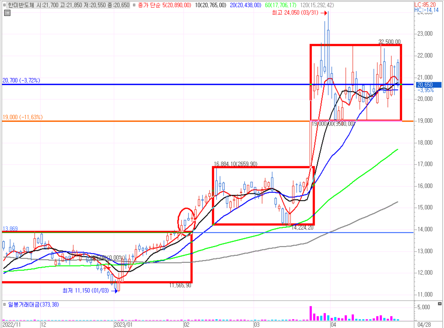 22,500원 박스권 상단으로 확인되고, 19,000원 하단부근까지 온다면 손절 가능성이 있다.
