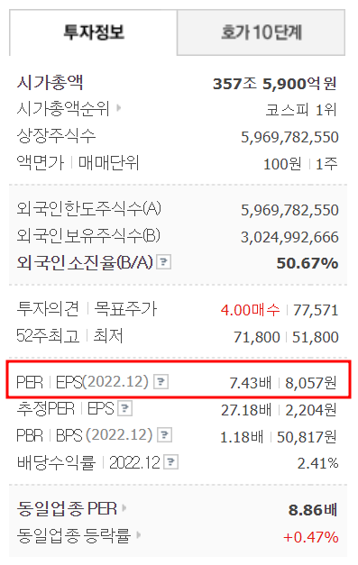 현재가 60,000원 / EPS(주당순이익) 8,057원