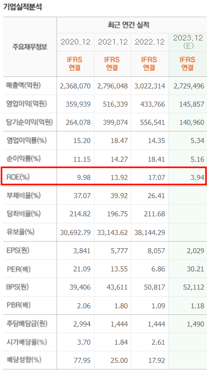 ROE는 당기순이익을 자기자본으로 나눠 백분률로 계산