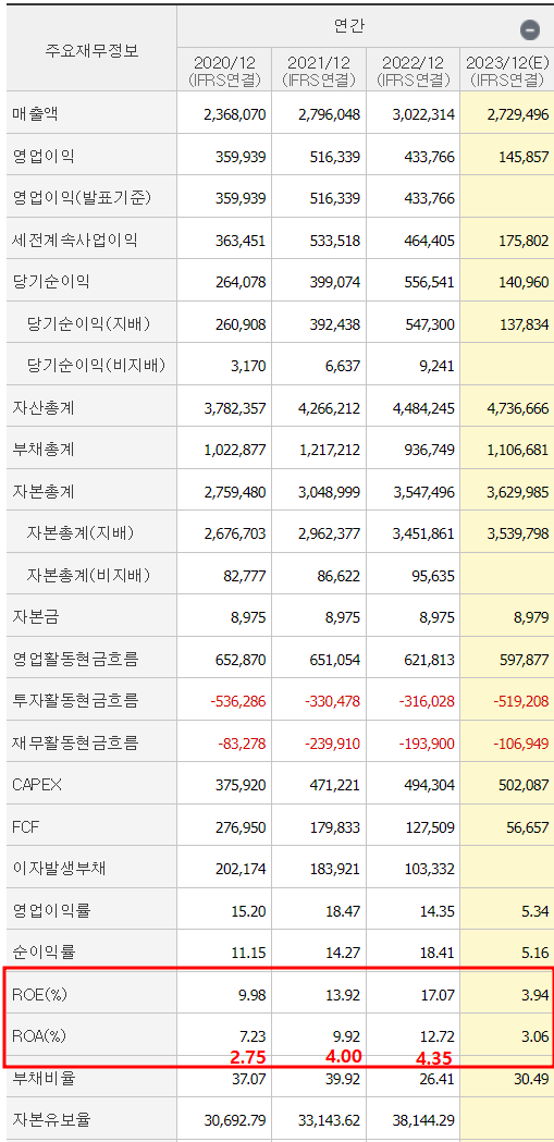 ROA(%) = 당기순이익 / 총자산(자기자본+부채) X 100